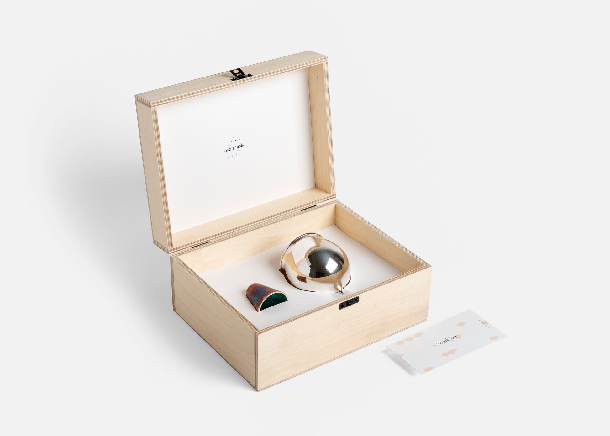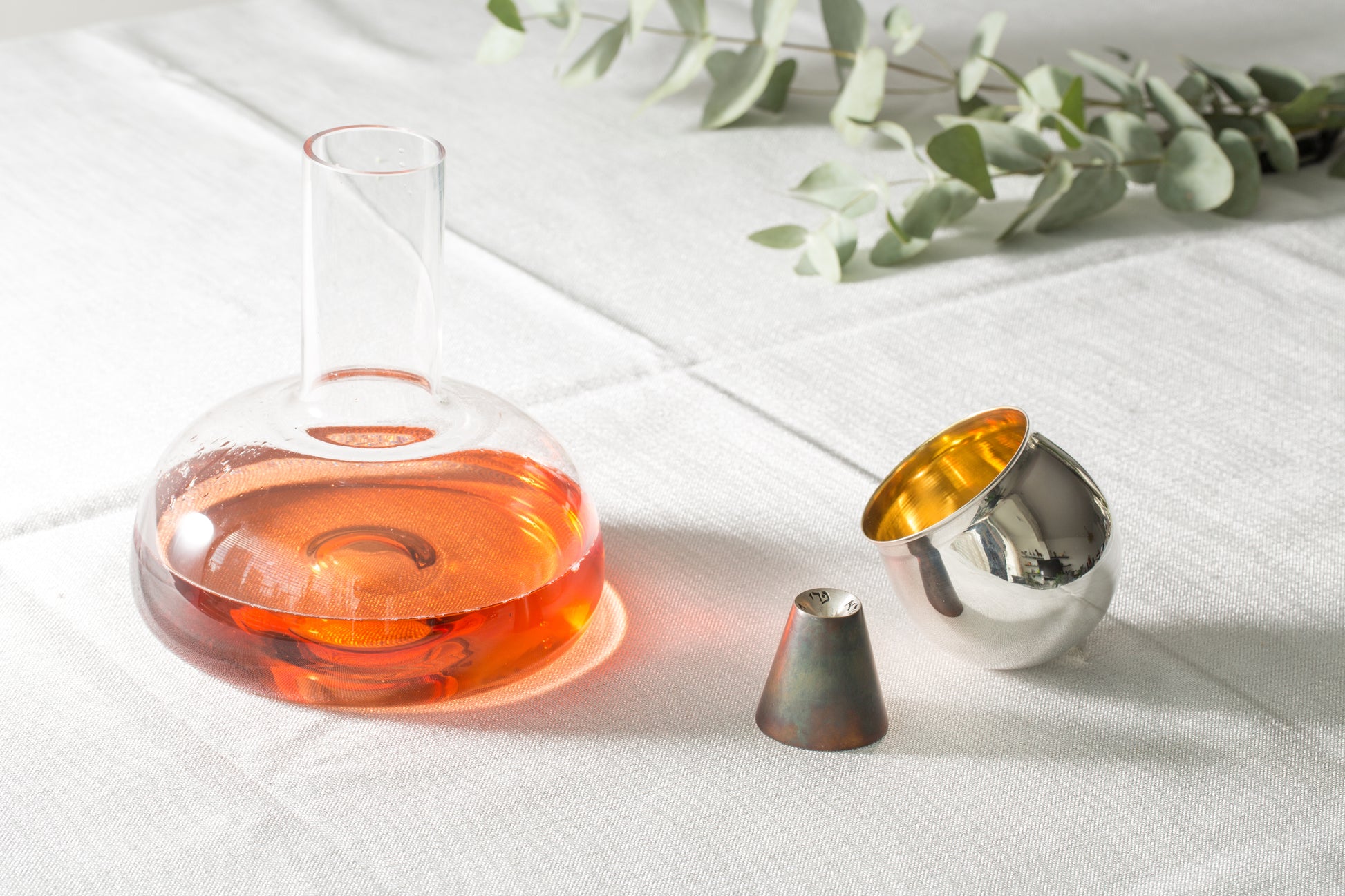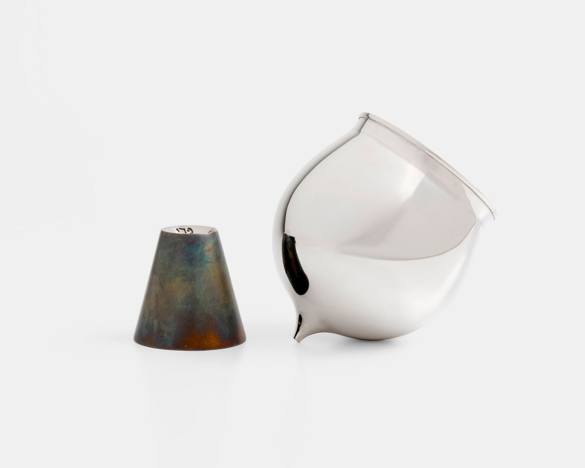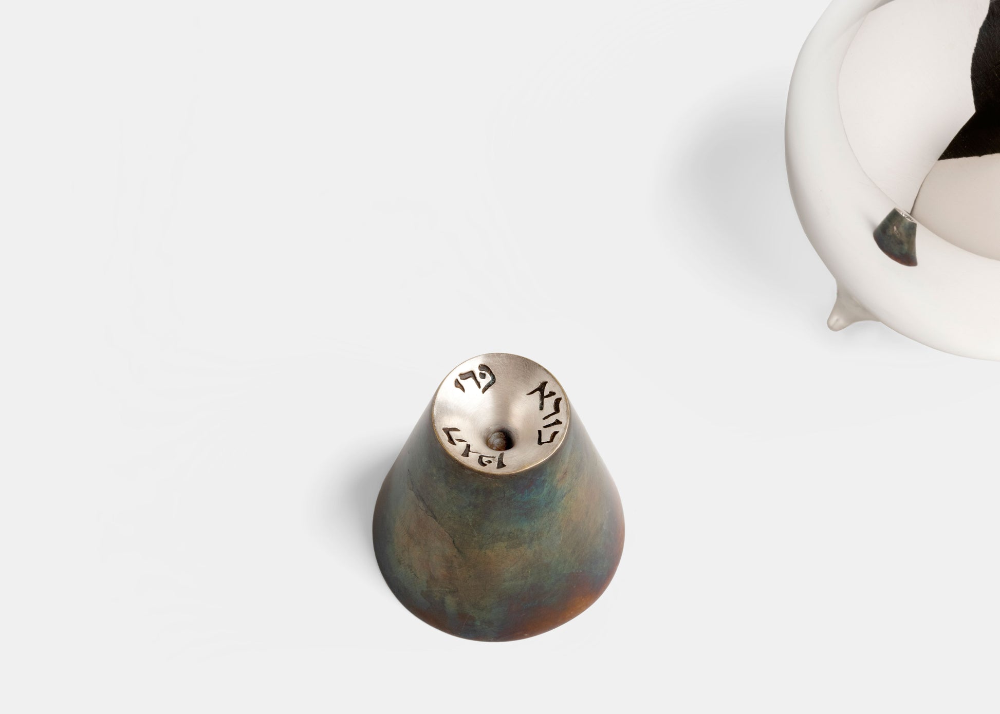 The deconstruction of the cup into two distinct units gestures at the ceremony itself, in which the kiddush cup passes from hand to hand, only to return to the ceremony leader once the circle is complete.The hebrew text 'Borei Pri Hagafen' is revealed once the bowl is separated from the base. The script was designed by a master calligrapher, representing a modern interpretation of the ancient Hebrew script used in period scrolls and letters unearthed in the Judean desert area.In Ceremonials I aspire to link between Jewish history, polklor and heritage with modern design, in order to create meaningful judaica heirlooms that will last for generations.Porcelain Kiddush cup, meticulously made to create a meaningful, distinct kiddush ritual.
