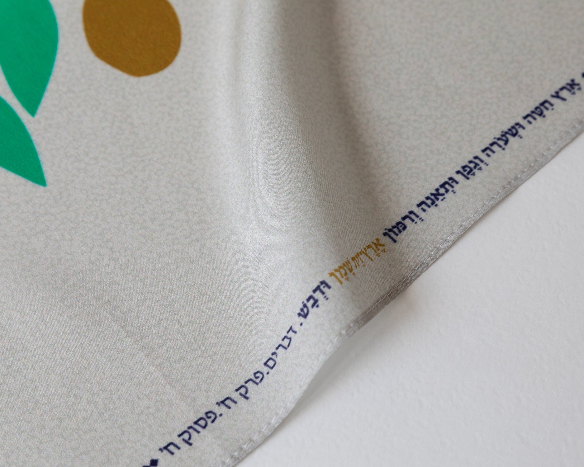 Handcrafted in 100% silk, this challah cover honors the beauty of the Seven Species with a bold, elegant print inspired by mid-century Israeli design.