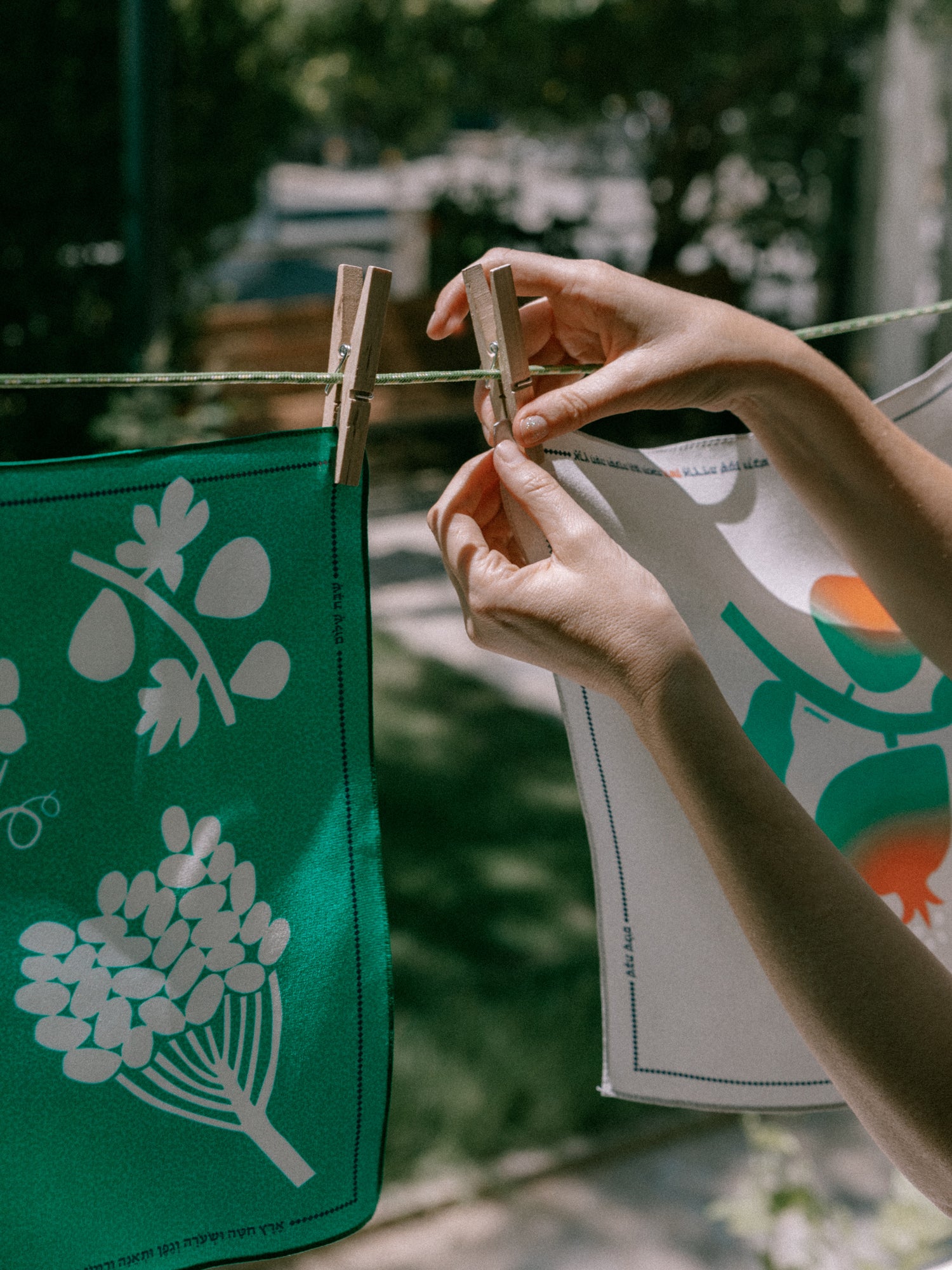 Handcrafted in 100% silk, this challah cover honors the beauty of the Seven Species with a bold, elegant print inspired by mid-century Israeli design.