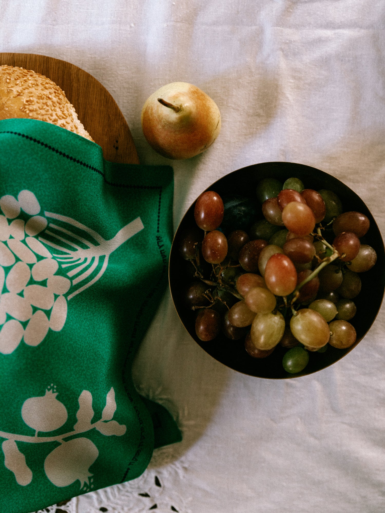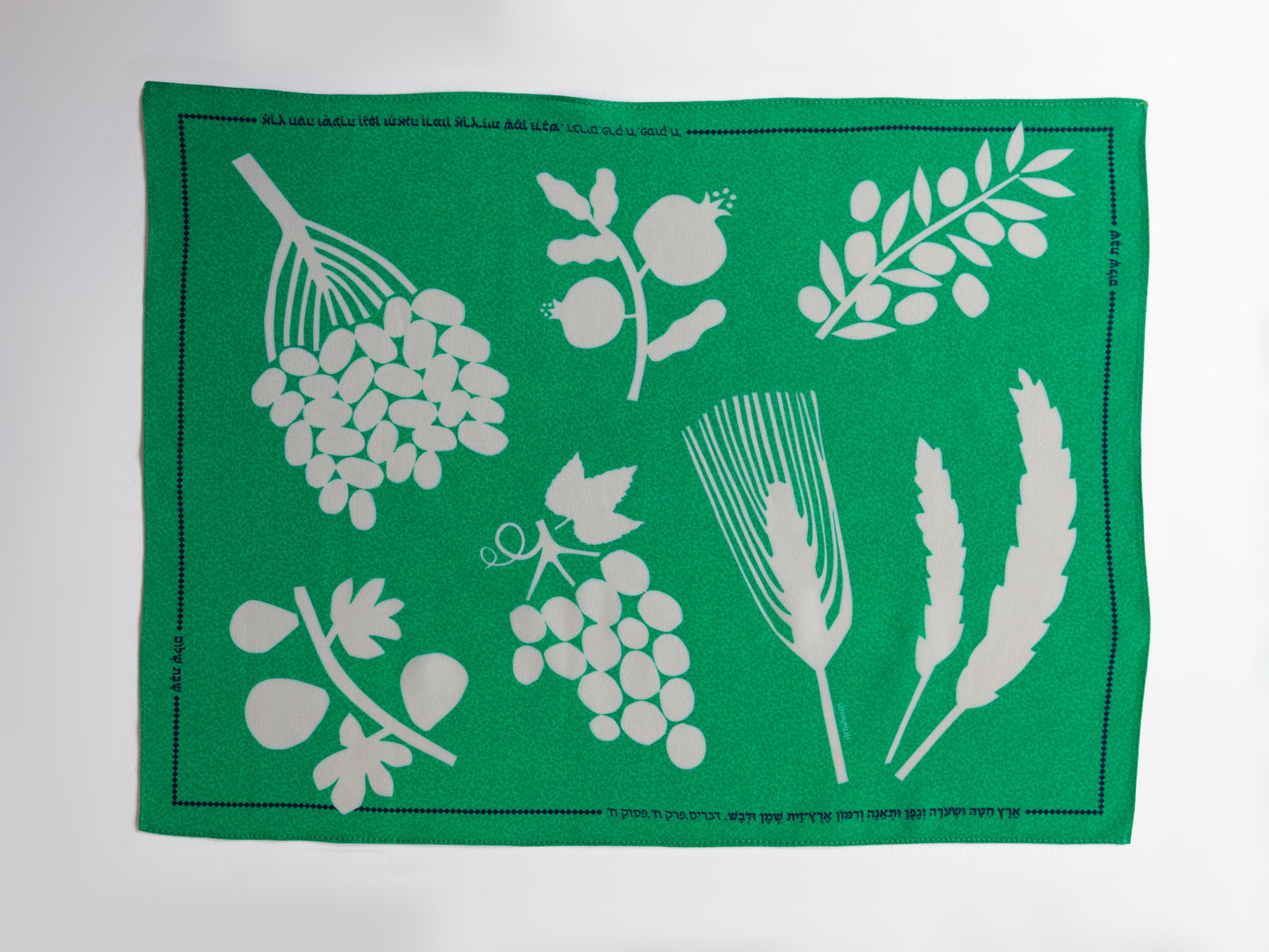 The Eretz challah cover features imagery of the Seven Species of the Land of Israel, originally created as hand-cut paper silhouettes, then digitally refined and delicately colored.