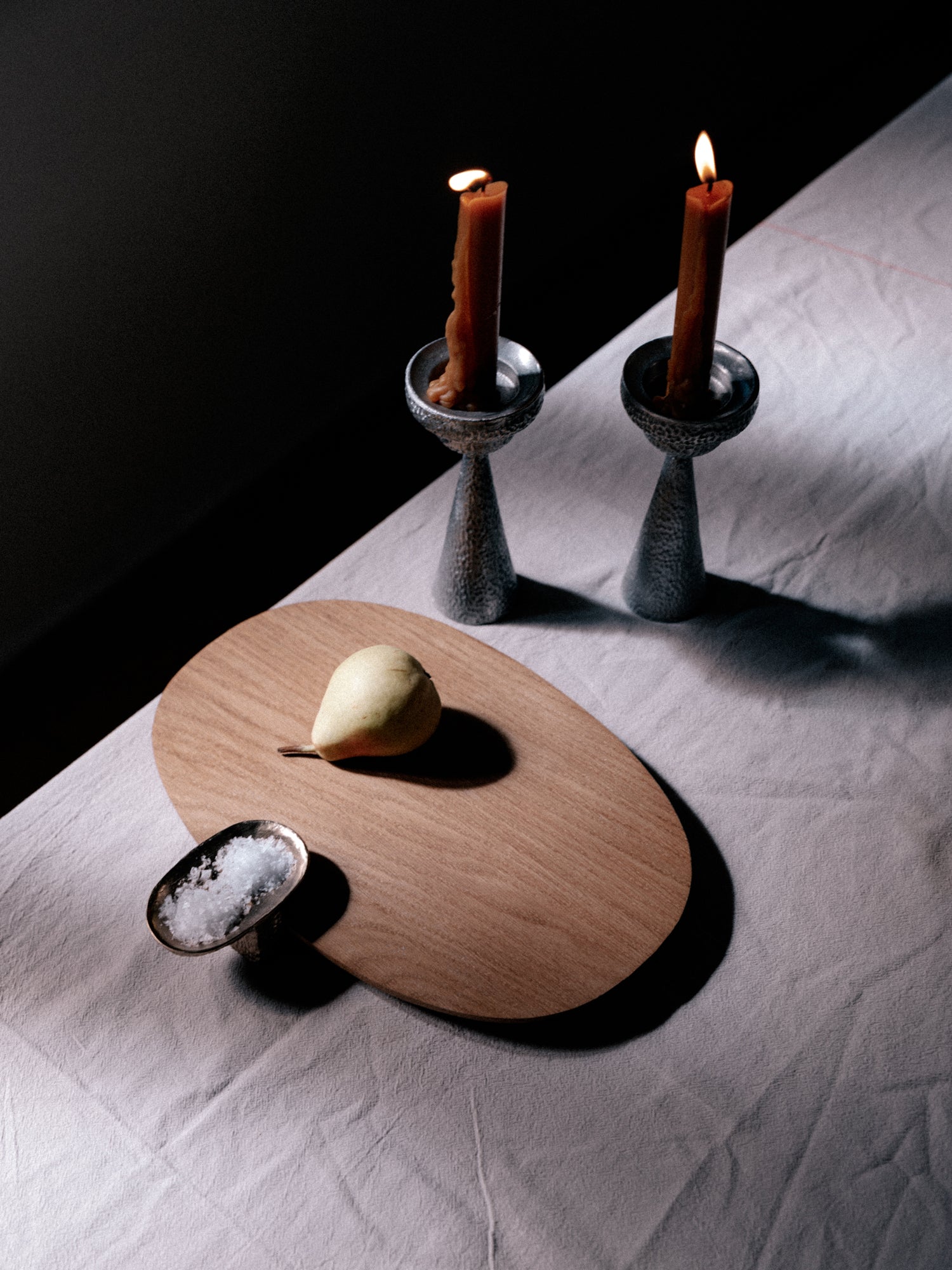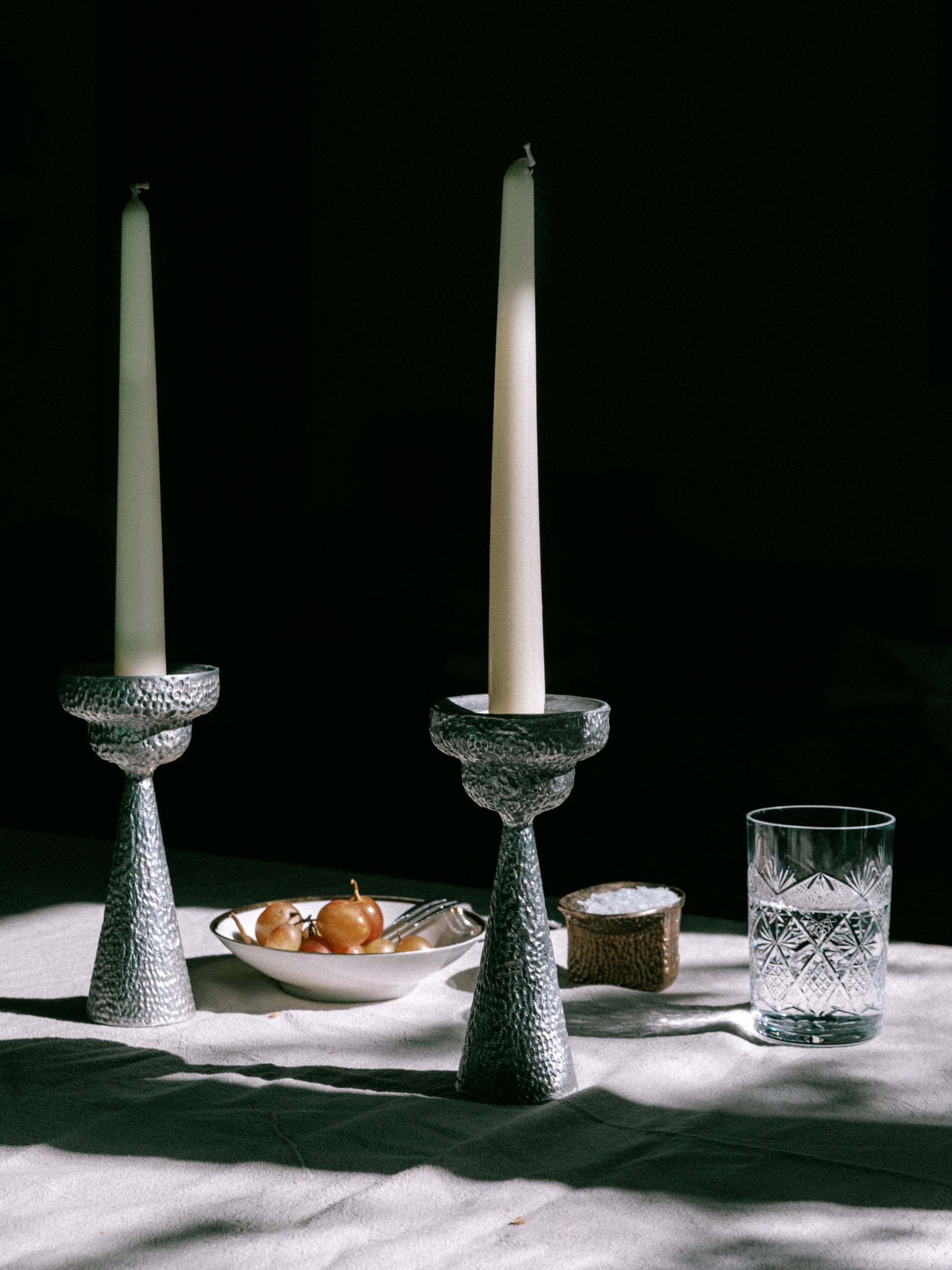 The gently flared form and deep textured surface evoke the quiet dignity of early ritual vessels, while offering a modern home for both taper and tealight candles.