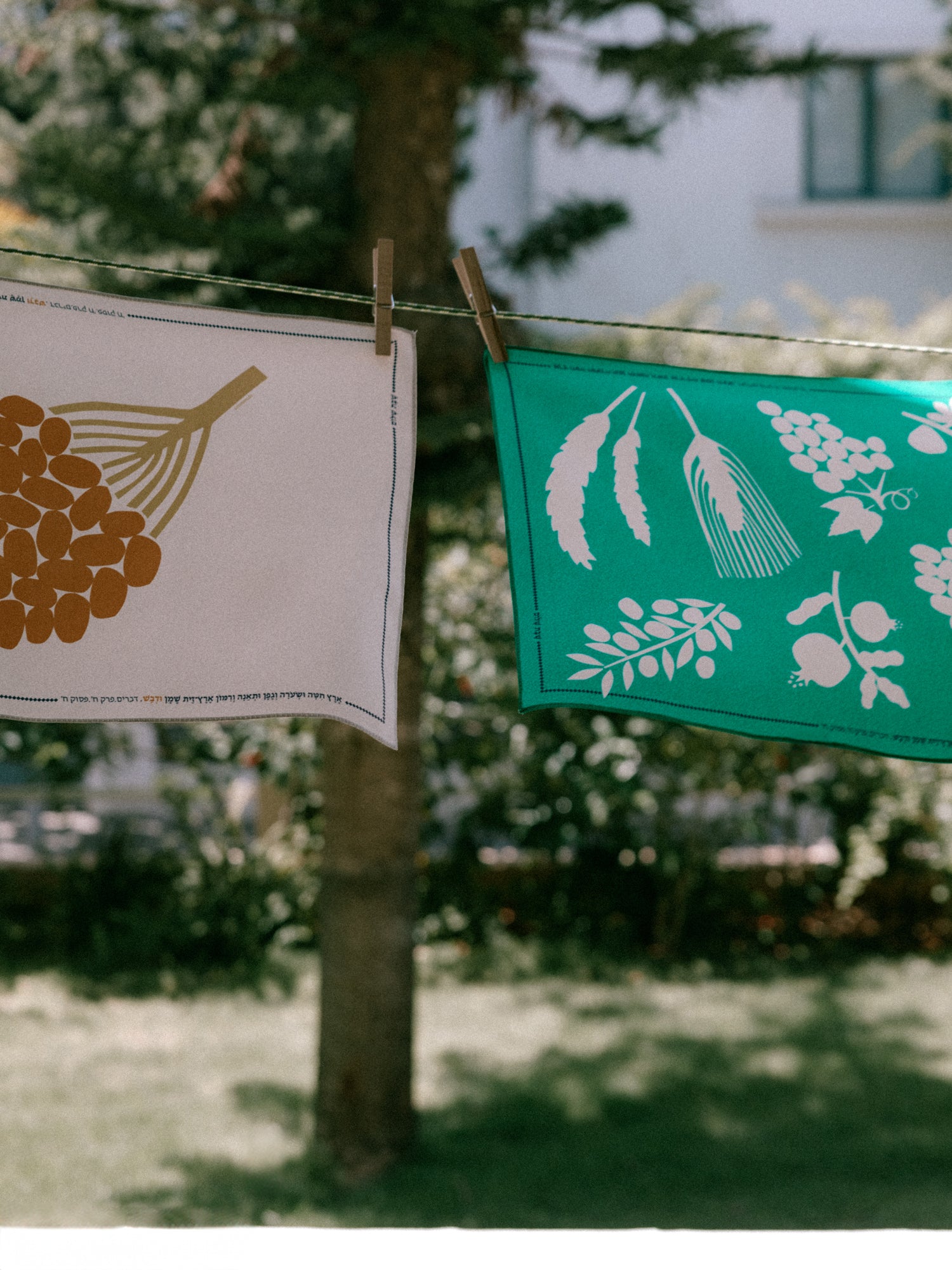 The Eretz challah cover features imagery of the Seven Species of the Land of Israel, originally created as hand-cut paper silhouettes, then digitally refined and delicately colored.