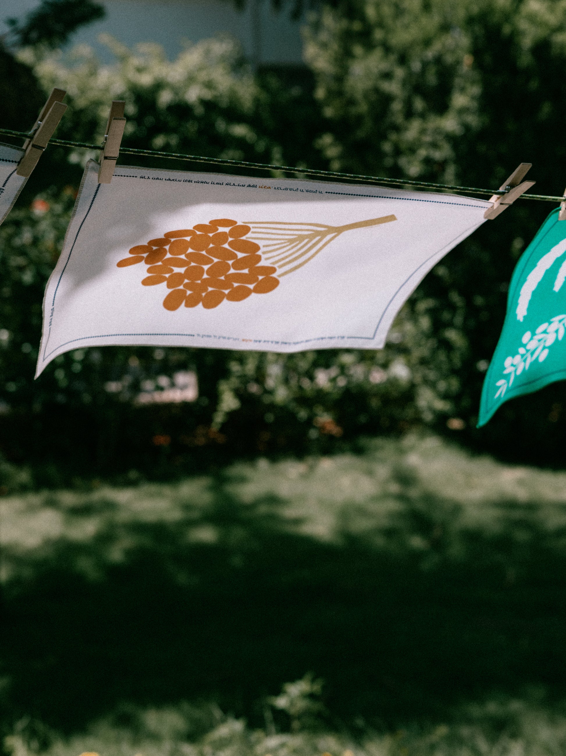 The Eretz challah cover features imagery of a Date palm, one of the Seven Species of the Land of Israel, originally created as hand-cut paper silhouettes, then digitally refined and delicately colored.