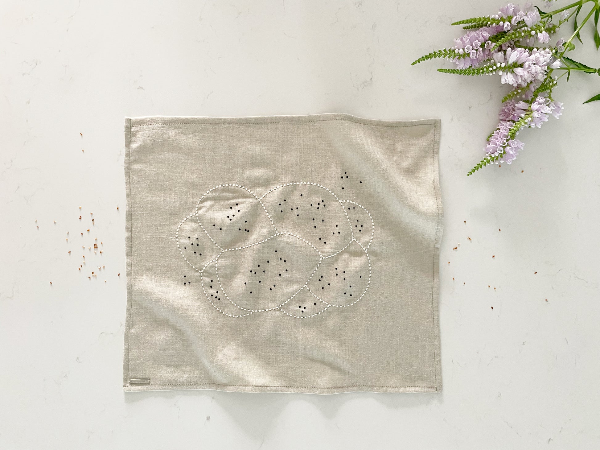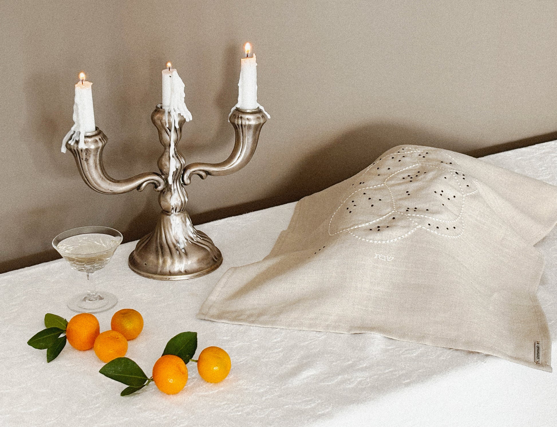 The Ruth Challah Cover is a quiet tribute to tradition, reimagined with contemporary grace. Handcrafted in Tel Aviv, it features a minimalist challah motif embroidered on fine Italian linen, with pearl rhinestones evoking sesame seeds from the Shabbat table.